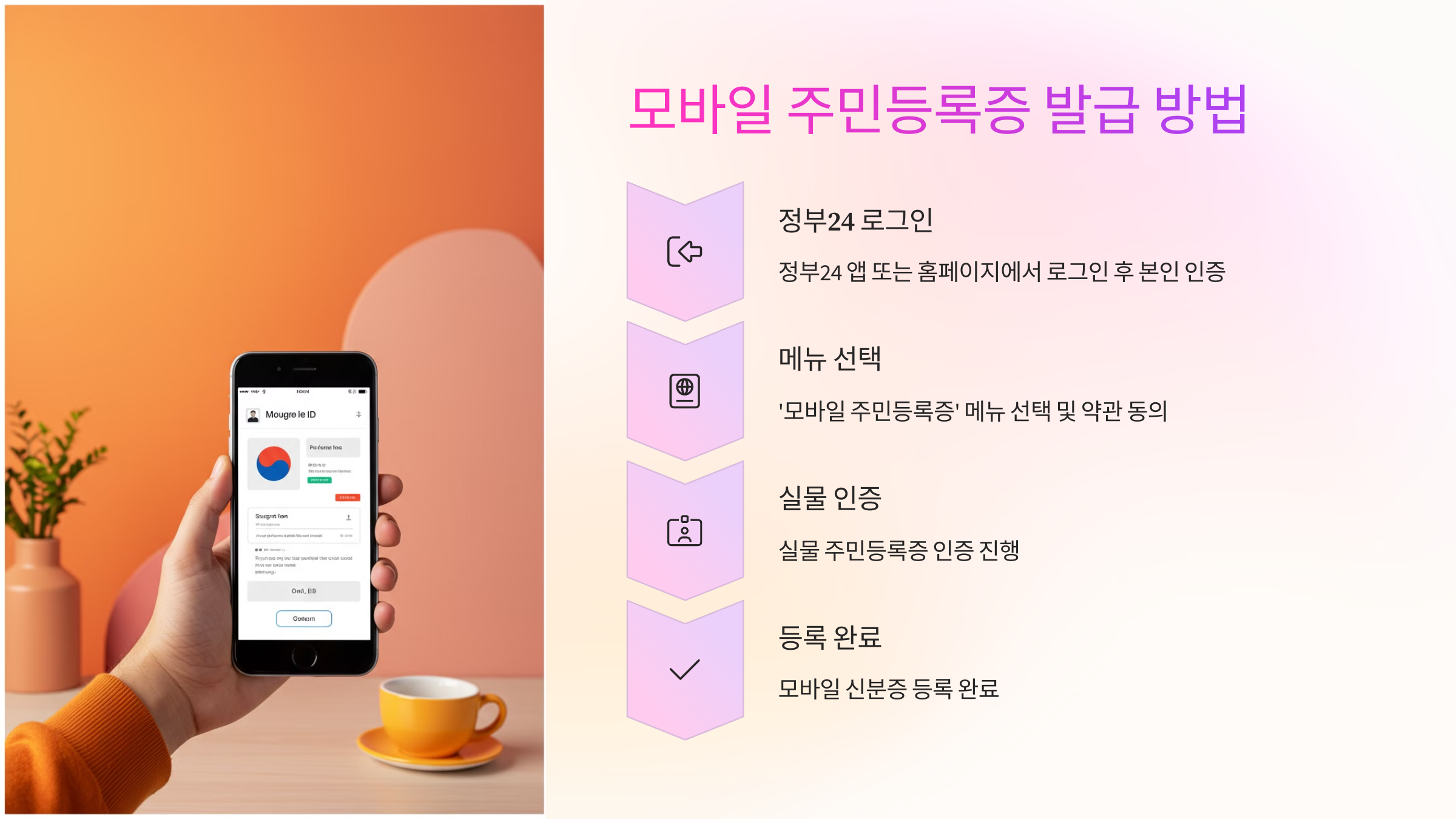 모바일 주민등록증은 정부24 홈페이지를 통해 쉽고 간편하게 신청 가능합니다. 아래 절차를 따라하시고 지금 바로 간편하게 발급해 보세요!
