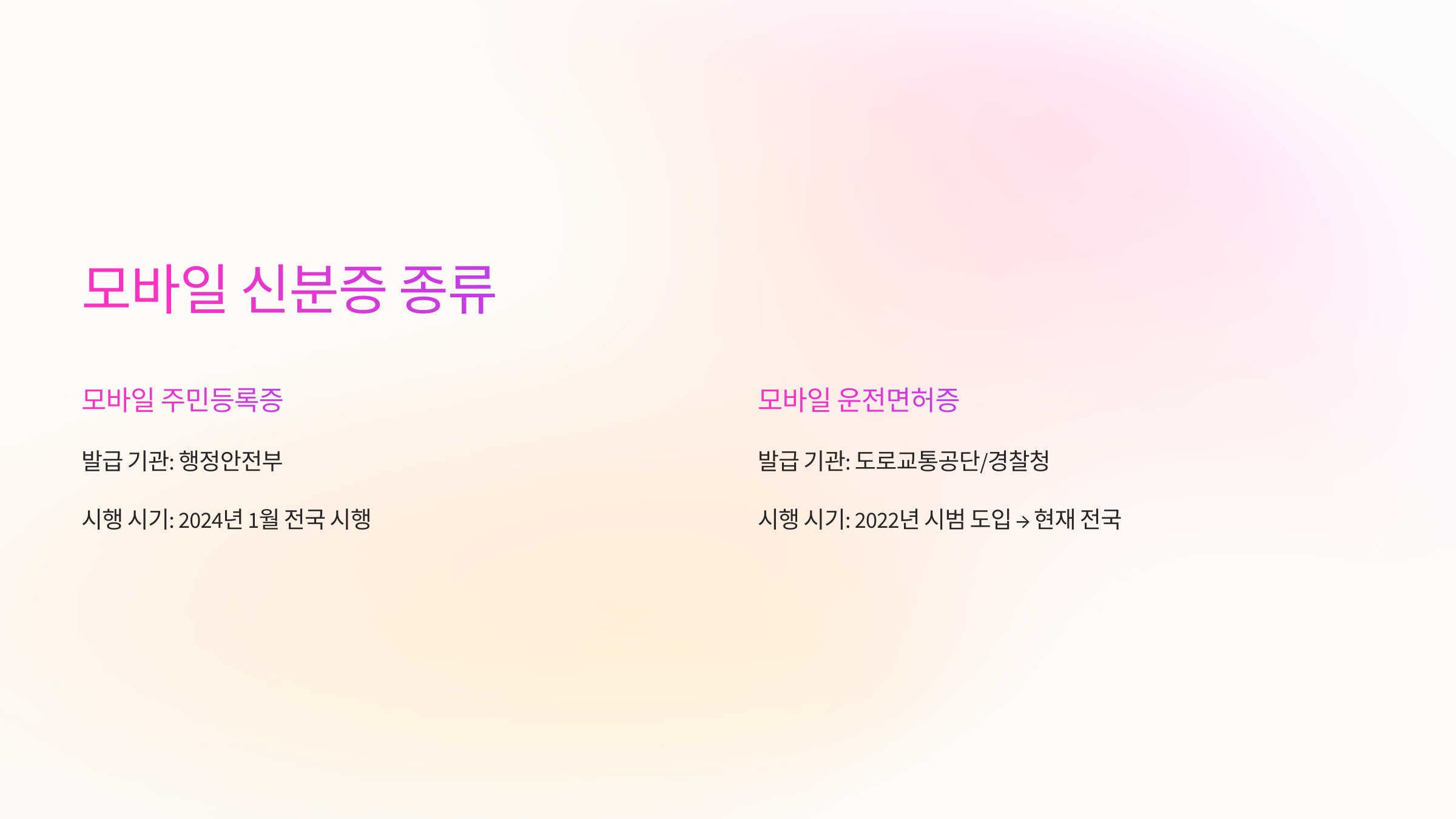 모바일 신분증은 모바일 주민등록증, 운전면허증 2가지가 있습니다. 아래를 통해 자세한 내용을 확인해 보세요