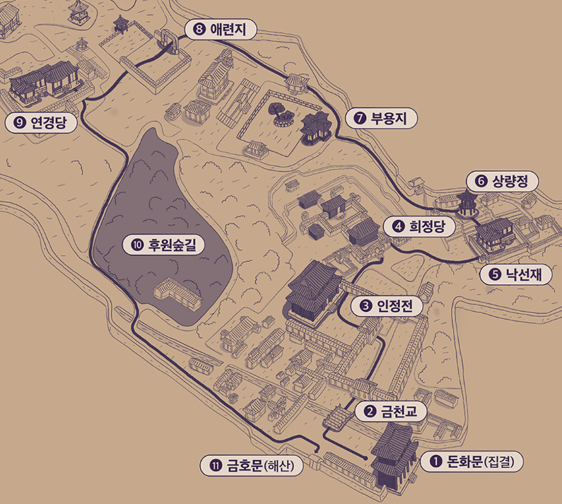 - 돈화문 집결 > 금천교 > 인정전 > 회정당 > 낙선재 > 상량정(대금 연주) > 부용지·부용정(거문고 연주)